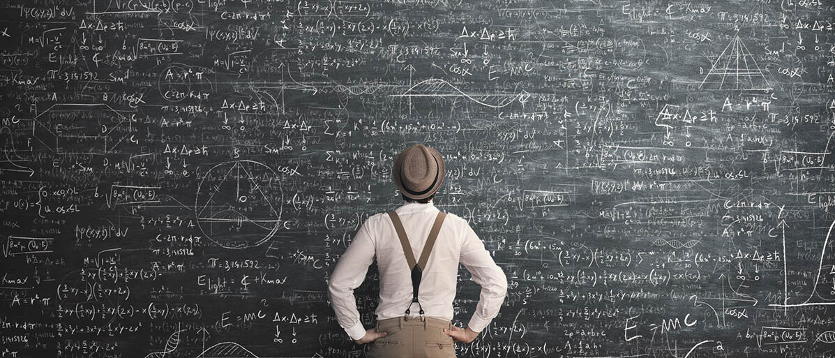 Ein Mann steht mit dem Rücken zu uns vor einer riesigen Tafel. Er hat die Hände in die Hüften gestützt und betrachtet unzählige Formeln und Berechnungen auf der Tafel.© francescoch/iStock/Getty Images Plus