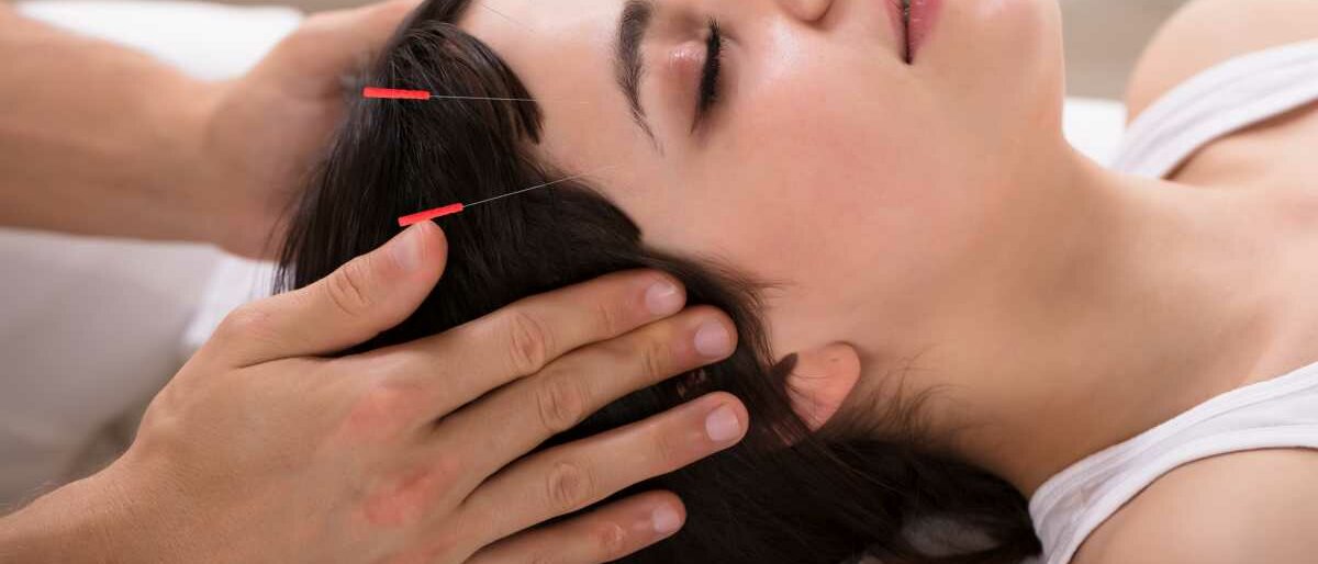 Eine Frau auf einer Behandlungsliege wird an Stirn und Kinn akupunktiert.