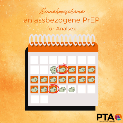 Für eine anlassbezogene PrEP nehmen die Anwender 24 bis spätestens 2 Stunden vor dem Sex zwei Tabletten Emtricitabin/Tenofovir ein, dann täglich eine weitere Tablette bis zwei Tage nach dem letzten Sex.