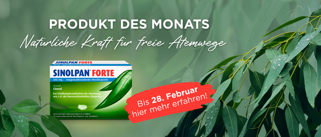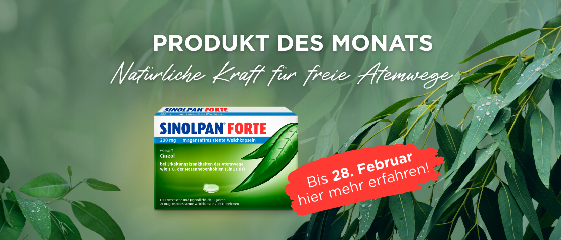 Sinolpan® ist eine solche Therapieoption. Der Wirkstoff Cineol, gewonnen aus reinem Eukalyptusöl, wirkt umfassend: Er wirkt antientzündlich, reduziert die Produktion zähflüssigen Nasensekrets und sorgt für eine abschwellende Wirkung der Schleimhäute. Gleichzeitig löst Cineol festsitzenden Schleim, befreit die Nase und lindert Druckkopfschmerz. Eine klinische Studie zeigte, dass Cineol gegenüber Placebo zu einer klinisch relevanten Symptomreduktion von bis zu 3 Tagen führte.1 Zudem wird Cineol in den Leitlinien zur Behandlung der akuten Rhinosinusitis empfohlen.2