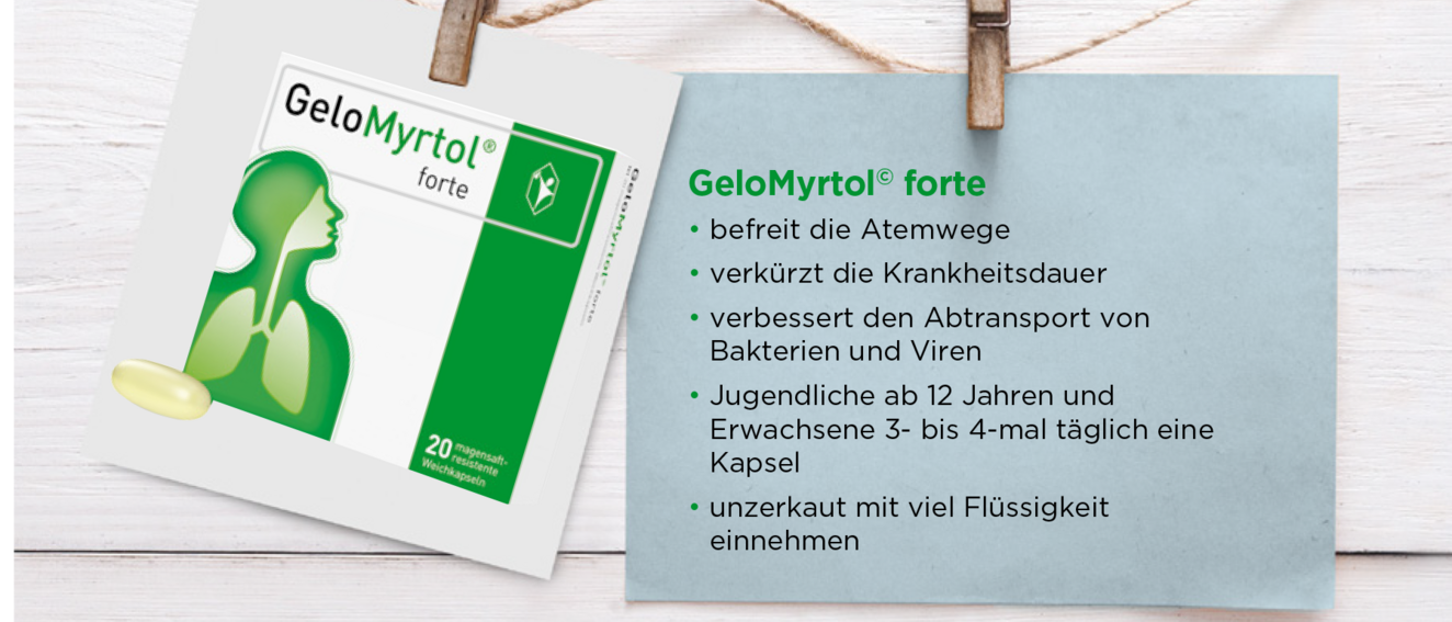 GeloMyrtol® forte aktiviert die Selbstreinigung in den gesamten Atemwegen. So behandeln Ihre Kunden mit nur einem Produkt Symptome wie Husten, Schnupfen, Druckkopfschmerz und sind schneller wieder fit.