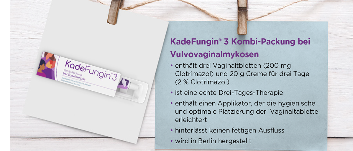 Bei einer akuten Vulvovaginalmykose empfiehlt die aktuelle S2k-Leitlinie die lokale Therapie mit einem Imidazol-Antimykotikum wie Clotrimazol. Dabei weist die Leitlinie auf eine Studie1 hin, die zeigen konnte, dass die Kombination einer intravaginalen Behandlung mit Tabletten (je 200 mg Clotrimazol) mit einer Creme (2 % Clotrimazol) für den äußeren Intimbereich (Vulva) über drei Tage offenbar einen signifikant stärkeren Rückgang der Symptomatik erzielt als die intravaginale Therapie allein. Diesen Vorteil bietet der Marktführer Dr. Kade mit der KadeFungin® 3 Kombi-Packung.