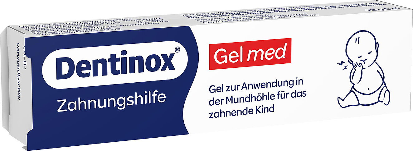 Die Zeit des Zahnens ist nicht nur für Säuglinge eine aufregende und herausfordernde Phase, sondern auch für ihre Eltern. Um das empfindliche und gereizte Zahnfleisch zu beruhigen und den Druckschmerz des durchbrechenden Zahnes zu lindern, hat sich die Zahnungshilfe1 bewährt – früher unter dem Namen Dentinox® Gel N, nun als Dentinox® Gel med. Das mild wirkende Arzneimittel enthält eine Tinktur aus Kamillenblüten, deren entzündungshemmende Eigenschaften in der traditionellen Medizin seit Langem beschrieben sind.2 Hinzu kommen die örtlich schmerzstillenden Wirkstoffe Lidocain und Lauromacrogol 400 in kindgerechter Dosierung (Lidocainhydrochlorid 1 H2O 3,4 mg/g und Lauromacrogol 400 3,2 mg/g). Das gut haftende Gel wirkt lokal genau dort, wo das durchbrechende Zähnchen Probleme bereitet.