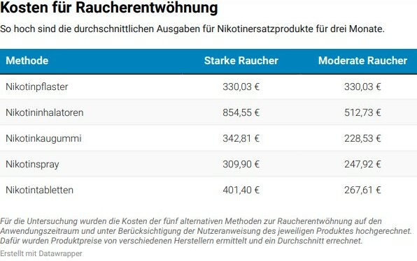 Die kostengünstigste Methode, um das Rauchen langfristig aufzugeben, ist das Nikotinkaugummi – der Anwendungszeitraum ist mit sechs Monaten dafür doppelt so lang wie bei den anderen Methoden. Für ein moderates Raucherverhalten werden für ein halbes Jahr rund 458 Euro benötigt. Für den besseren Vergleich mit den anderen Produkten wird in der Untersuchung von Kosten von 229 Euro für drei Monate ausgegangen. Auf dem zweiten Platz der kostengünstigsten Alternativen folgt das Nikotinspray mit 248 Euro für drei Monate, gefolgt von den Nikotintabletten mit einer Aufwendung von 268 Euro. Das Nikotinpflaster belegt den vierten Platz mit 330 Euro für einen Entwöhnungszeitraum von drei Monaten. Mit einem deutlichen Abstand von 200 Euro landet der Nikotininhalator auf dem letzten Platz und stellt die teuerste Methode zur Raucherentwöhnung dar, mit Gesamtkosten von rund 513 Euro.