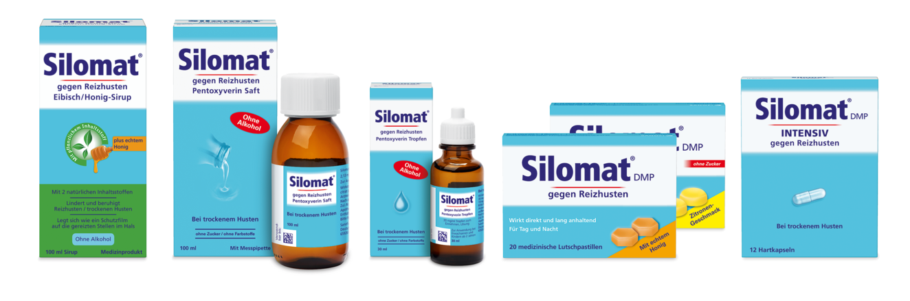 Die gereizten Schleimhäute haben so die Gelegenheit in Ruhe abzuheilen. Das breitgefächerte Silomat®-Sortiment ermöglicht eine Empfehlung je nach individuellen Vorlieben des Apothekenkunden: Intensiv Kapseln, Lutschpastillen mit Zitronen- oder Honiggeschmack mit dem Wirkstoff Dextromethorphan oder Saft und Tropfen mit dem Wirkstoff Pentoxyverin – alle Produkte sind alkohol- und – bis auf die Lutschpastillen mit Honig – zudem zuckerfrei. Weitere Informationen finden Sie unter: www.silomat.de