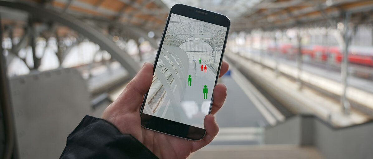 Hand mit einer Smartphone-App zur Nachverfolgung von Infektionsketten; im Hintergrund ein Bahnhof.© fermate / iStock / Getty Images Plus