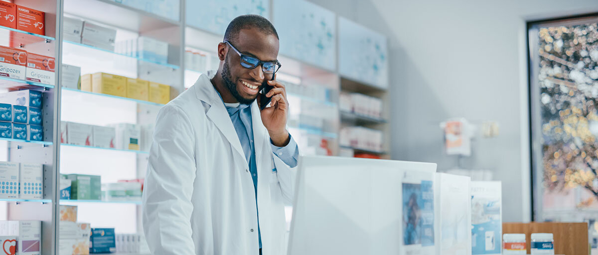 Ein Apotheker oder PTA steht am HV-Tisch, blickt in den Computer und telefoniert.© gorodenkoff / iStock / Getty Images Plus