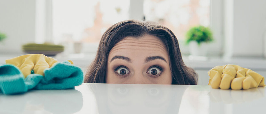 Eine Frau versteckt sich hinter einer Tischplatte. Sie trägt Putzhandschuhe und -lappen.© Deagreez / iStock / Getty Images Plus