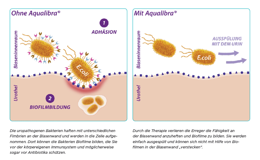 So wird schon in einem frühen Stadium der Blasenentzündung verhindert, dass die Bakterien die Möglichkeit bekommen, sich in der Blasenwand einzunisten. Gut zu wissen: Therapeutisch eingesetzte Zucker, wie beispielsweise D-Mannose, beeinträchtigen nur eine einzige Fimbrien-Art der Bakterien. Es gibt jedoch darüber hinaus auch Mannose-resistente Fimbrien, die den Bakterien die Anhaftung an die Blasenzelle ermöglichen. Es wurde gezeigt, dass die Inhaltsstoffe von Aqualibra® alle relevanten Anheftungsmöglichkeiten der Bakterien beeinträchtigen und somit keine Ausweichstrategien zulassen.