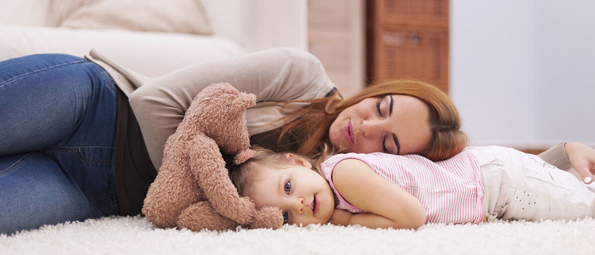 Mutter und Tochter liegen mit einem Teddy auf dem Teppich. Die Tochter ist hellwach, die Mutter ist auf dem Rücken der Tochter eingeschlafen.© gpointstudio/ iStock / Getty Images Plus