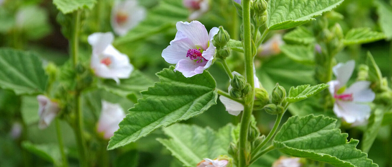 Marshmallow – was wir als schaumige Süßigkeit kennen, bedeutet übersetzt wortwörtlich: Sumpfmalve. Die typisch amerikanischen Marshmallows gehen auf eine Erfindung französischer Zuckerbäcker zurück: pâte de guimauve – Schaumzucker aus Eibisch. Für die Herstellung war tatsächlich die Sumpfmalve nötig, Althaea officinalis. Die krautige, dichtbehaarte Pflanze stammt aus der Familie der Malvaceae und ist mit der Baumwolle und der Stockrose verwandt. Alle Blüten weisen die typischen fünfzähligen, rosafarbenen Kronblätter auf, die um eine Säule aus verwachsenen Stempeln und Staubblättern gruppiert sind. Althaea steht unter Naturschutz, sodass die Pflanzen im Kulturanbau gewonnen werden.