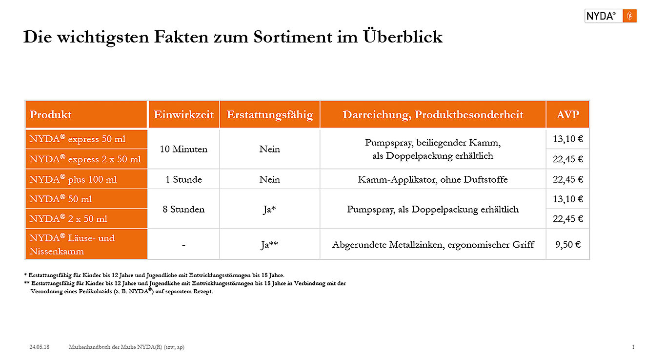 Mit NYDA® – einfach weg. Das Sortiment von NYDA® umfasst verschiedene Präparate, wobei jedes auf dem physikalischen Wirkprinzip des einzigartigen 2-Stufen-Dimeticons beruht. NYDA® und die NYDA® Doppelpackung sind erstattungsfähig und die am häufigsten von Pädiatern verschriebenen Pedikulozide.2 Die umfangreiche Studienlage zur Erstattungsfähigkeit legt für diese Produkte eine Einwirkzeit von acht Stunden zugrunde. Das duftstofffreie NYDA® plus, welches als Selbstmedikationspräparat nicht an diese Voraussetzung gebunden ist, verbleibt nach dem Auftragen mit dem praktischen Kamm-Applikator für eine Stunde auf dem Haar und ist ideal zur Selbstanwendung.