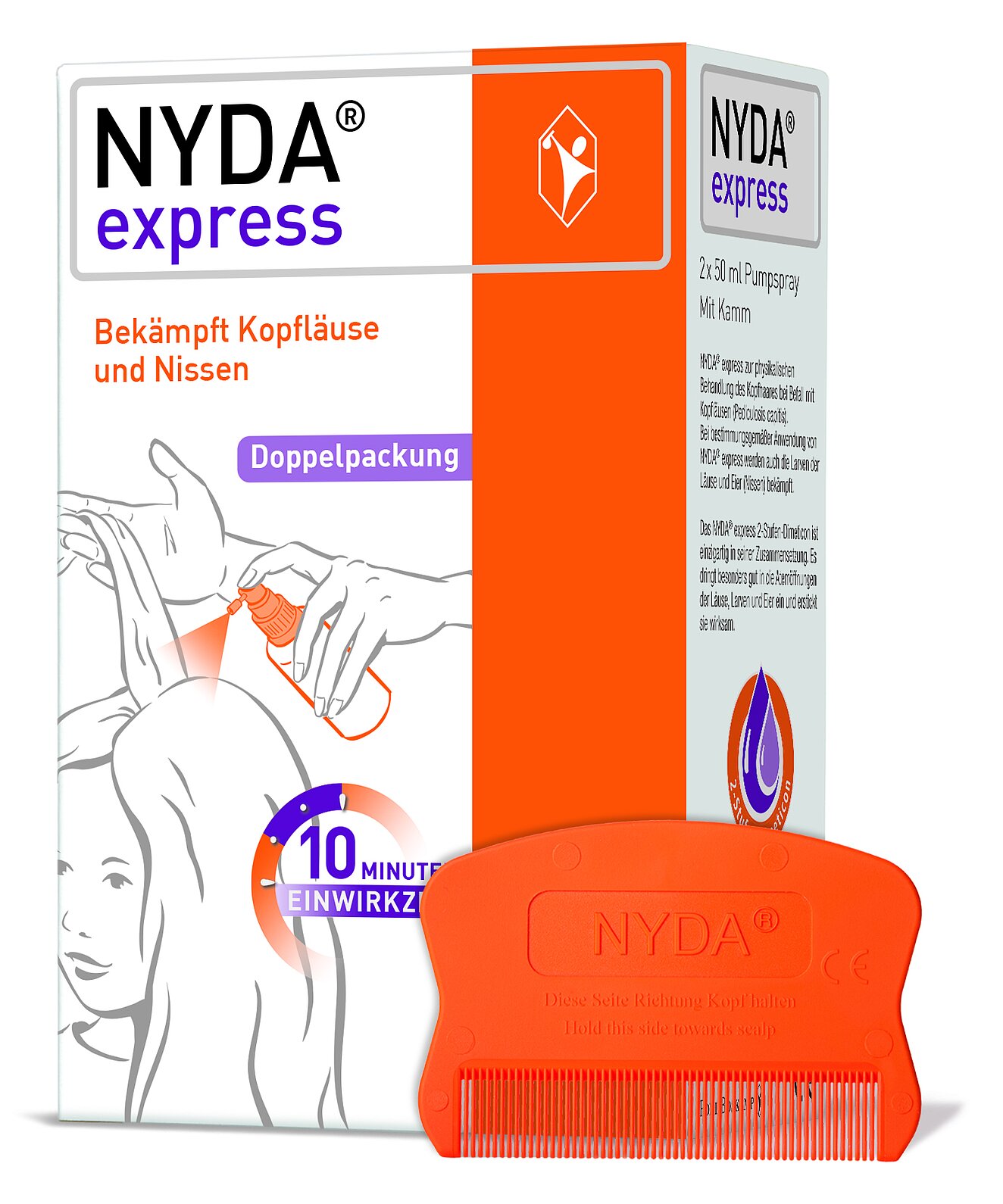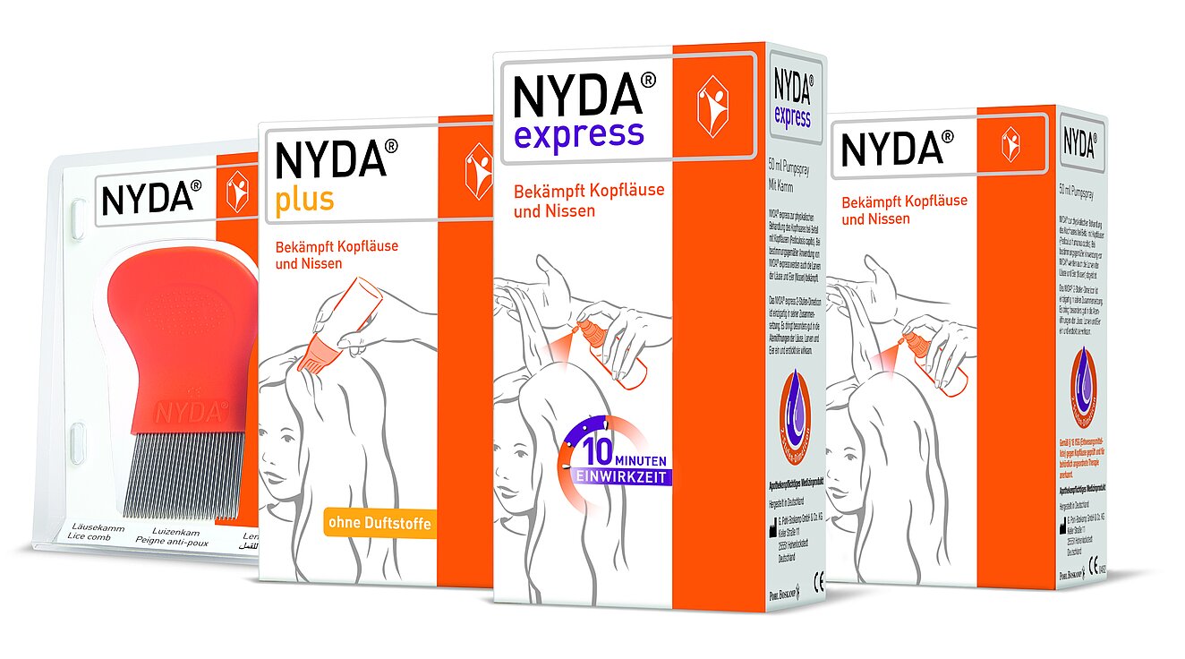 Für Kunden, die es besonders eilig haben, eignet sich NYDA® express, eine Lösung als Pumpspray mit beiliegendem Kamm und einer Einwirkzeit von zehn Minuten. Aktuelle Studien bestätigen auch hier die hohe Wirksamkeit. Neu auf dem Markt ist die praktische, familienfreundliche Doppelpackung von NYDA® express. Mit dem NYDA®-Sortiment können Kopfläuse sogar in der Schwangerschaft, Stillzeit sowie bei Babys ohne Alterseinschränkung effektiv behandelt werden. Zur vollständigen Beseitigung des Kopflausbefalls empfiehlt das Robert Koch-Institut für jedes Läusemittel eine zweite Behandlung nach neun Tagen (+/– 24 Stunden).