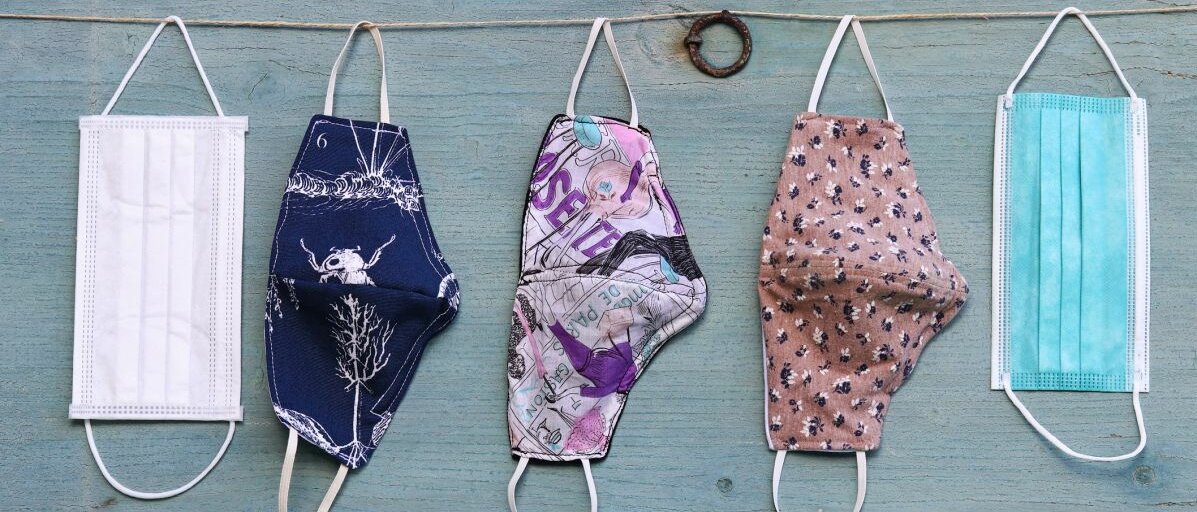Stoffmasken und medizinische Masken an einer Wäscheleine aufgehängt