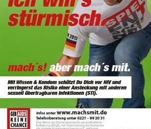 Rechtzeitig zur bevorstehenden Fußball-Europameisterschaft hat die BZgA zum Thema HIV und STI im Rahmen ihrer Präventionskampagne "Wissen & Kondom" ein sportliches Sondermotiv veröffentlicht. Zu sehen ist ein dynamischer Sportler mit dem Statement "Ich will's stürmisch". Das Motiv wird seit Mai als Anzeige in ausgewählten Publikumszeitschriften mit sportlichem Schwerpunkt geschaltet. Damit will die BZgA Menschen daran erinnern, sich in Risikosituationen mit Kondomen vor einer HIV-Infektion zu schützen. Gleichzeitig wird auch auf die Ansteckungswege und Symptome anderer sexuell übertragbarer Infektionen aufmerksam gemacht.