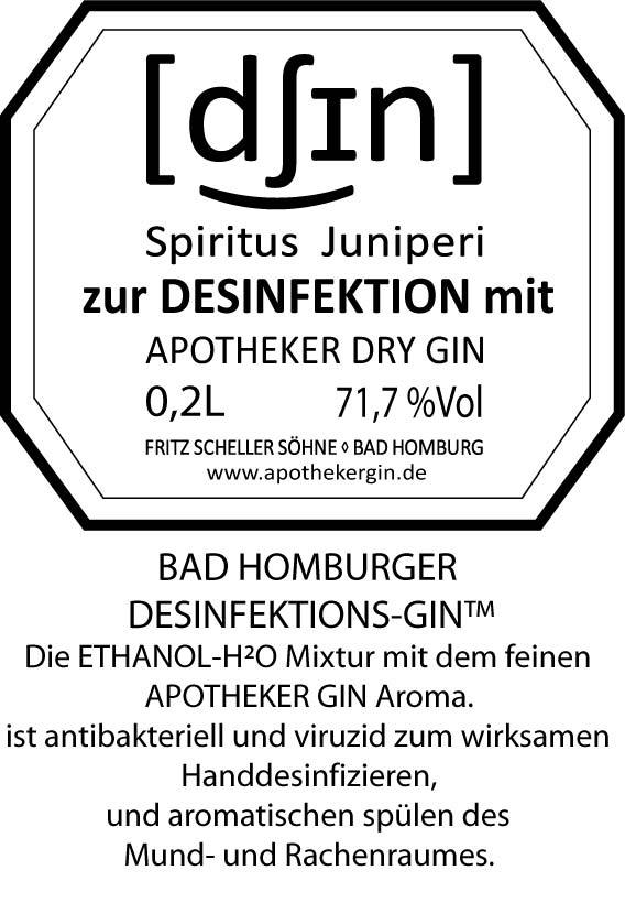 Um dies zu erreichen, hat der Spiritus Juniperi zur Desinfektion mit 71,7 Prozent einen höheren Alkoholgehalt als gewohnt: Der Apotheker Dry Gin zum Verzehr ist mit 47,4 Prozent sonst besser genießbar - das neue Produkt darf zwar heruntergeschluckt werden, soll den Apotheken aber nicht in erster Linie zur Verköstigung dienen.