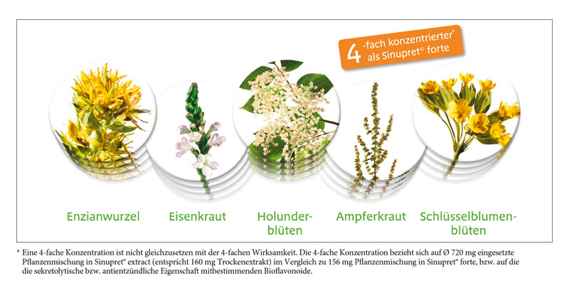 * Eine 4-fache Konzentration ist nicht gleichzusetzen mit der 4-fachen Wirksamkeit. Die 4-fache Konzentration bezieht sich auf Ø 720 mg eingesetzte Pflanzenmischung in Sinupret® extract (entspricht 160 mg Trockenextrakt) im Vergleich zu 156 mg Pflanzenmischung in Sinupret® forte, bzw. auf die die sekretolytische bzw. antientzündliche Eigenschaft mitbestimmenden Bioflavonoide.