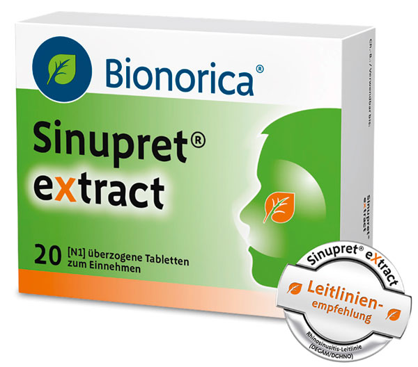 Sinupret® extract, Sinupret® forte – Zusammensetzung: 1 überzogene Tablette von Sinupret extract enthält als arzneilich wirksame Bestandteile: 160,00 mg Trockenextrakt (3-6:1) aus Enzianwurzel; Schlüsselblumenblüten; Ampferkraut; Holunderblüten; Eisenkraut (1:3:3:3:3). 1. Auszugsmittel: Ethanol 51% (m/m). Sonstige Bestandteile: Glucose-Sirup 2,935 mg; Sucrose 133,736 mg; Maltodextrin 34,000 mg; Sprühgetrocknetes Arabisches Gummi; Calciumcarbonat; Carnaubawachs; Cellulosepulver; mikrokristalline Cellulose; Chlorophyll-Pulver 25% (E 140); Dextrin (aus Maisstärke); Hypromellose; Indigocarmin; Aluminiumsalz (E 132); Magnesiumstearat (Ph.Eur.) [pflanzlich]; Riboflavin (E 101); hochdisperses Siliciumdioxid; hochdisperses hydrophobes Siliciumdioxid; Stearinsäure; Talkum; Titandioxid (E 171). 1 überzogene Tablette von Sinupret forte enthält als arzneilich wirksame Bestandteile: Eisenkraut, gepulvert 36 mg; Enzianwurzel, gepulvert 12 mg; Gartensauerampferkraut, gepulvert 36 mg; Holunderblüten, gepulvert 36 mg; Schlüsselblumenblüten mit Kelch, gepulvert 36 mg. Sonstige Bestandteile: Glucosesirup 2,750 mg; Lactose-Monohydrat 48,490 mg; Sucrose (Saccharose) 123,816 mg; Sorbitol 0,444 mg; Calciumcarbonat (E 170); Chlorophyll-Pulver 25% (E 141); Dextrin; Eudragit E 12,5; Gelatine; Indigocarmin, E 132, Aluminiumhydroxid; Kartoffelstärke; Maisstärke; leichtes Magnesiumoxid; Montanglycolwachs; Riboflavin (E 101); raffiniertes Rizinusöl; Schellack; hochdisperses Siliciumdioxid; Stearinsäure; Talkum; Titandioxid (E 171). Anwendungsgebiete: Sinupret extract: Bei akuten, unkomplizierten Entzündungen der Nasennebenhöhlen (akute, unkomplizierte Rhinosinusitis). Sinupret extract wird angewendet bei Erwachsenen und Jugendlichen ab 12 Jahren. Sinupret forte: Bei akuten und chronischen Entzündungen der Nasennebenhöhlen. Gegenanzeigen: Sinupret extract: Überempfindlichkeit gegen den Wirkstoff oder einen der genannten sonstigen Bestandteile. Magen- und/oder Zwölffingerdarmgeschwür. Keine Anwendung bei Kindern unter 12 Jahren. Keine Anwendung in der Schwangerschaft und Stillzeit. Patienten mit der seltenen hereditären Fructose-Intoleranz, Glucose-Galactose-Malabsorption oder Saccharase-Isomaltase-Mangel sollten Sinupret extract nicht einnehmen. Sinupret forte: Nicht einnehmen bei bekannter Überempfindlichkeit gegen einen der arzneilich wirksamen oder sonstigen Bestandteile. Patienten mit der seltenen hereditären Fructose-Intoleranz, Galactose-Intoleranz, Lactase-Mangel, Glucose-Galactose-Malabsorption oder Saccharase-Isomaltase-Mangel sollten Sinupret forte und Sinupret nicht einnehmen. Keine Anwendung bei Kindern unter 12 Jahren. Nebenwirkungen: Sinupret extract: Häufig Magen-Darm-Beschwerden (z. B. Übelkeit, Blähungen, Durchfall, Mundtrockenheit, Magenschmerzen). Gelegentlich lokale Überempfindlichkeitsreaktionen der Haut (Hautausschlag, Hautrötung, Juckreiz), systemische allergische Reaktionen (Angioödem, Atemnot, Gesichtsschwellung) und Schwindel. Sinupret forte: Gelegentlich Magen-Darm-Beschwerden (u. a. Magenschmerzen, Übelkeit). Selten Überempfindlichkeitsreaktionen der Haut (Hautausschlag, Hautrötung, Juckreiz) sowie schwere allergische Reaktionen (Angioödem, Atemnot, Gesichtsschwellung). Warnhinweise: Sinupret forte: Wie alle Arzneimittel Anwendung in der Schwangerschaft und Stillzeit nur nach strenger Indikationsstellung.