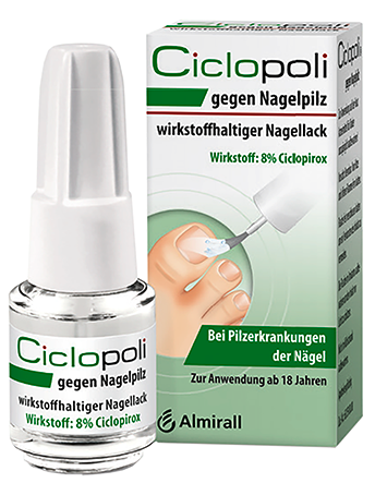 Ciclopoli® gegen Nagelpilz Wirkstoff: 8 % Ciclopirox. Zusammensetzung: 1 g wirkstoff haltiger Nagellack enthält 80 mg Ciclopirox. Sonstige Bestandteile: Ethylacetat, Ethanol 96 %, Cetylstearylalkohol, Hydroxypropylchitosan, gereinigtes Wasser. Anwendungsgebiete: Pilzerkrankungen der Nägel durch Dermatophyten und/oder andere Ciclopirox-sensitive Pilze. Gegenanzeigen: Überempfindlichkeit gegen einen Inhaltsstoff . Kinder unter 18 Jahren (fehlende Erfahrung). Nebenwirkungen: Sehr selten: Rötung, Schuppung, Brennen und Jucken an den behandelten Stellen. Warnhinweis: Enthält Cetylstearylalkohol, örtlich begrenzte Hautreizungen (z. B. irritative Kontaktdermatitis) möglich. Apothekenpflichtig. Stand: Jan. 2020. Polichem SA; 50, Val Fleuri; LU-1526 Luxemburg. Mitvertrieb: Almirall Hermal GmbH, Scholtzstraße 3, D-21465 Reinbek; info@almirall.de