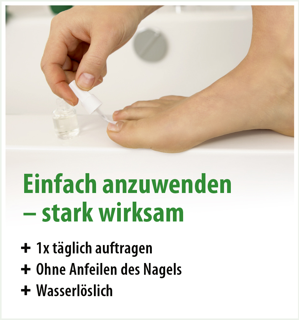 Ciclopoli lässt sich einfach anwenden: Den Lack täglich einmal auf den Nagel und die umliegende Haut auftragen. Weitere Hilfsmittel sind nicht nötig.