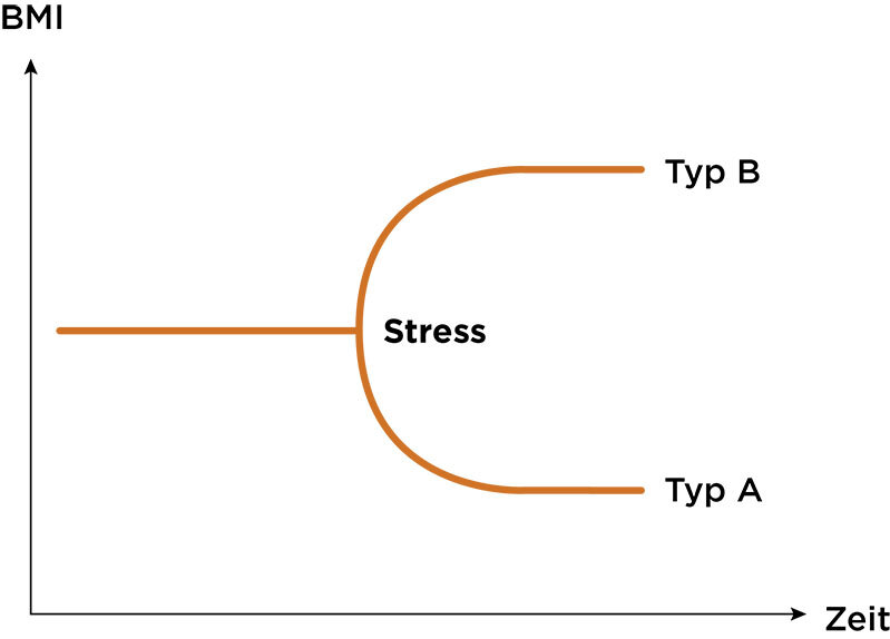 Die Abbildung zeigt, dass sich die Probanden ohne Stress im Neutralgewicht befinden. Bei chronischem Stress erhöht sich der Energiebedarf des Gehirns. Typ A-Gestresste ziehen sich die Energie aus dem Körper, werden dünner und sind stresssensibler. Typ B-Gestresste haben das Stresssystem angepasst, ein erhöhter Nahrungsbedarf wird signalisiert und sie nehmen zu.