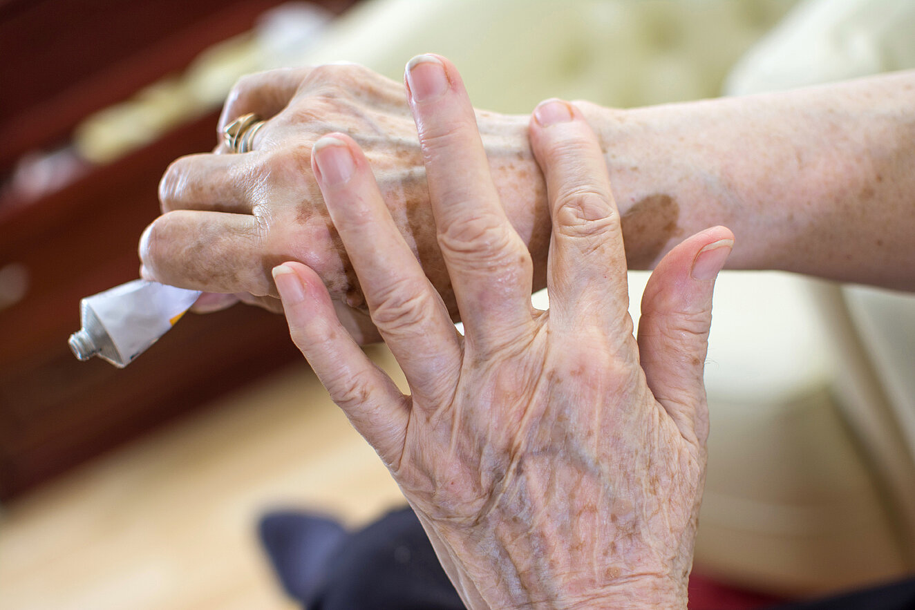 + Cremen Sie sich jeden Tag von Kopf bis Fuß ein. Gesichtscreme, Körperlotion, Hand- und Fußcreme der Wahl sollten die trockene Haut mit wertvollen Lipiden und mit Feuchtigkeit versorgen. Melkfett und Vaseline sind nicht geeignet!