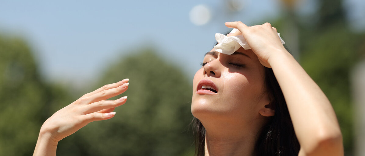 Frau ist es heiß und sie hat ein Taschentuch auf der Stirn© Pheelings Media / iStock / Getty Images Plus