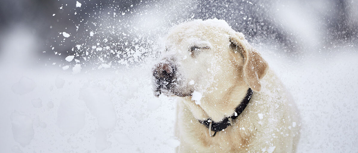 Hund mit schwarzem Halsband im Schnee. Er schüttelt seinen Kopf und Schnee wirbelt auf. © Chalabala / iStock / Getty Images Plus