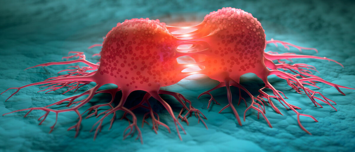 Eine rote Tumorzelle sitzt auf blauem Gewebe, die Zelle teilt sich gerade.© peterschreiber.media / iStock / Getty Images Plus