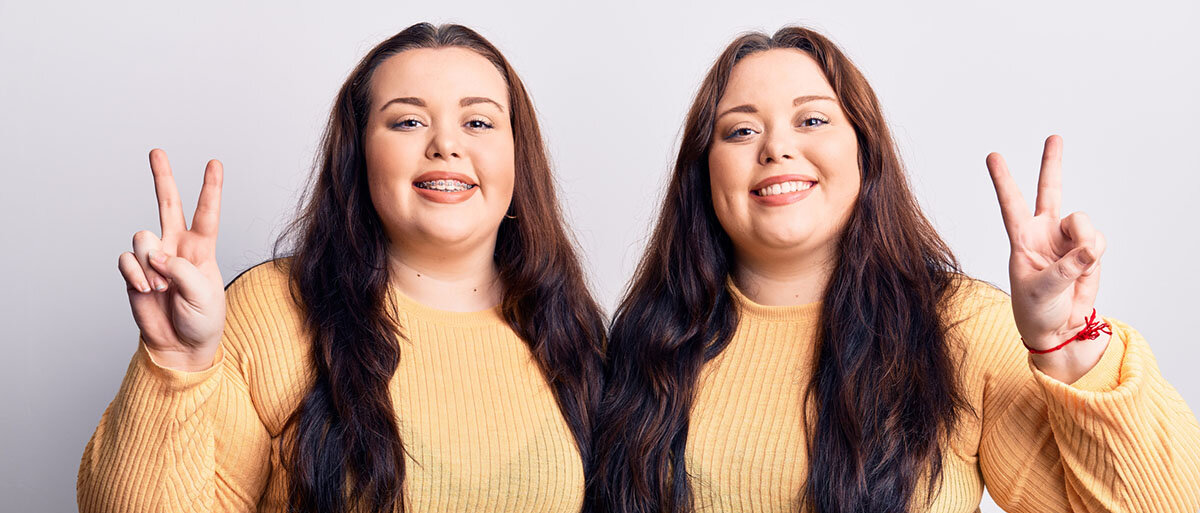 Zwei erwachsene, mehrgewichtige Frauen zeigen das Peace-Zeichen mit zwei nach oben gereckten Fingern. Sie sind Zwillinge.© AaronAmat / iStock / Getty Images