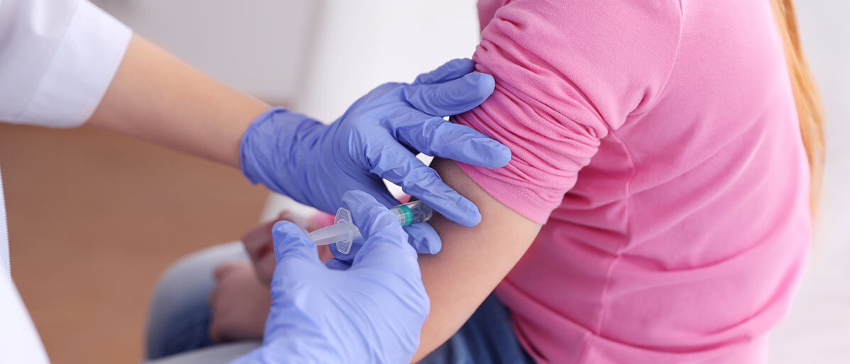 kleines Mädchen mit pinkem Shirt und Jeans, bekommt in den Oberarm eine Spritze© Liudmila Chernetska / iStock / Getty Images Plus