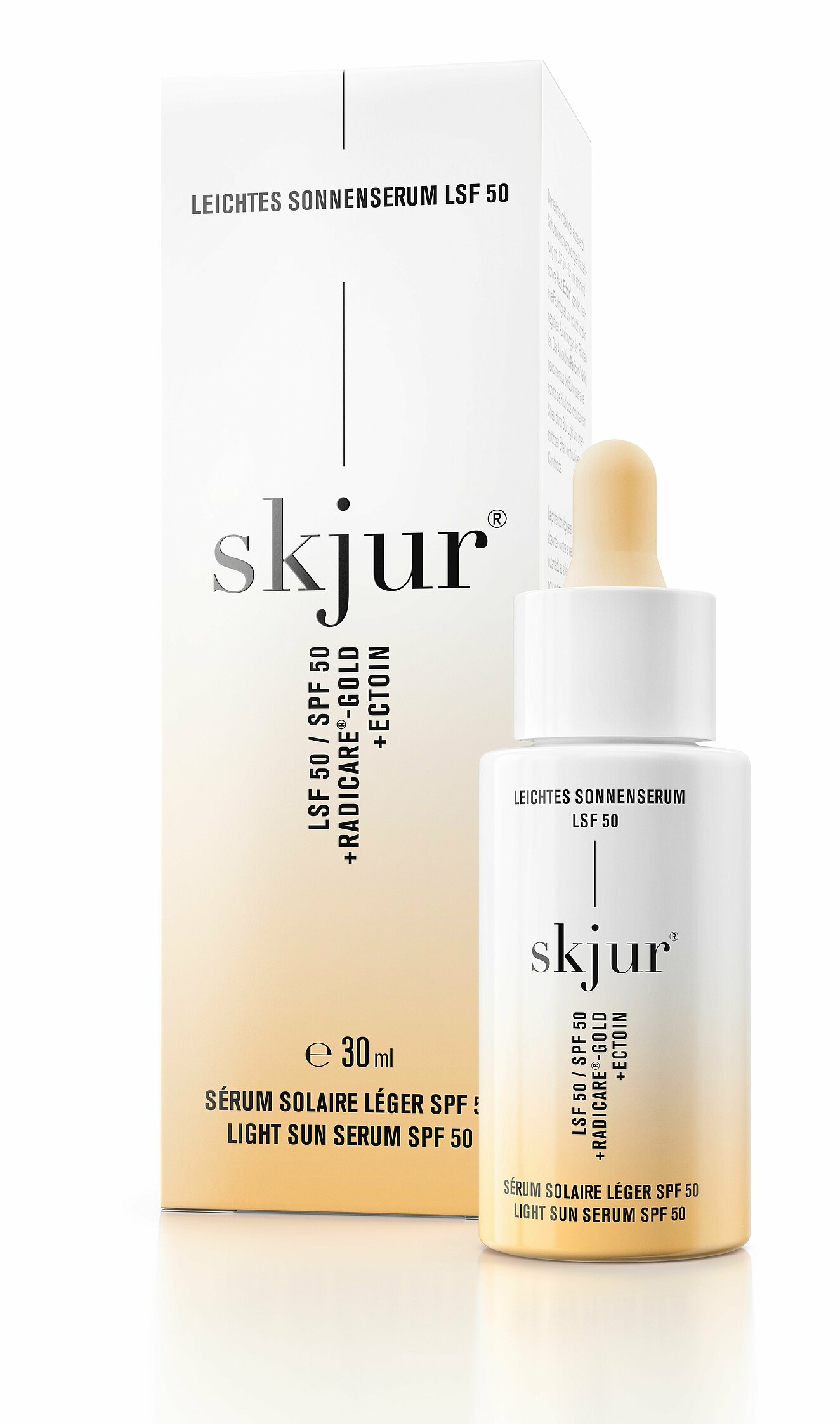 Das leichte und schnell einziehende Skjur® Sonnenserum mit Lichtschutzfaktor 50 schützt vor UVA- und UVB- Strahlen und enthält neben Ectoin auch den innovativen Wirkstoff Radicare®-Gold. Der antioxidative Inhaltsstoff aus der Süßwasseralge hilft, die Auswirkungen von oxidativem Stress durch Sonnenstrahlen, Blue Light und Infrarot-Strahlen zu mindern.