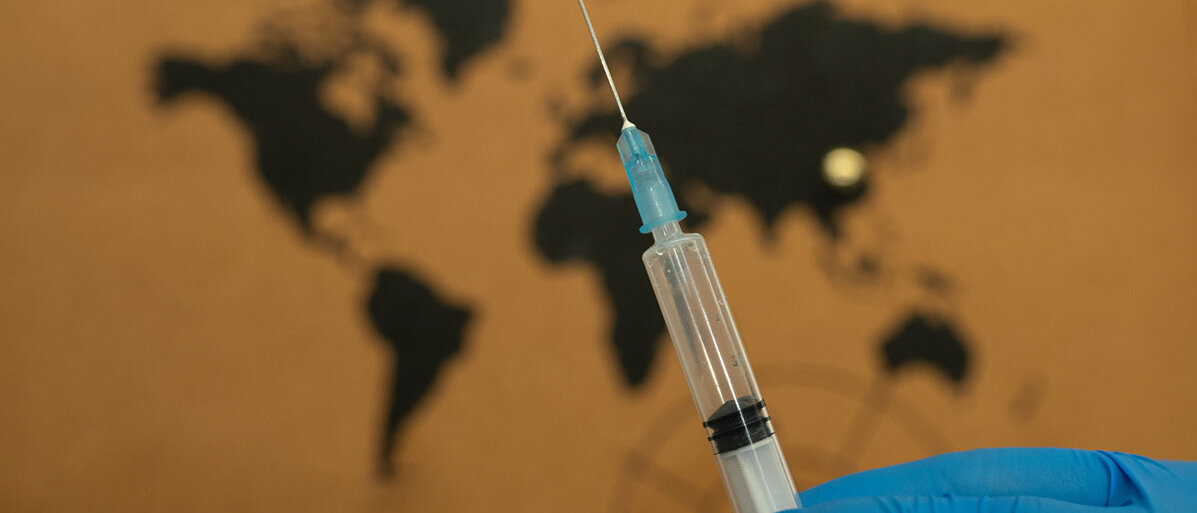 Weltkrate und davor ist eine Spritze zu sehen, die von einer Hand mit blauem Handschuh gehalten wird© ylenia cancelli / iStock / Getty Images Plus