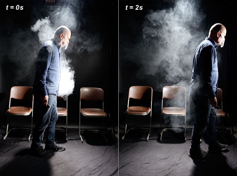 Nach dem Husten breitet sich eine Aerosolwolke schnell im Raum aus (die Bilder entstanden im Abstand von zwei Sekunden). Säßen auf den Stühlen im Hintergrund Personen, wären sie mit Gesicht und Oberkörper dem Aerosol voll ausgesetzt.