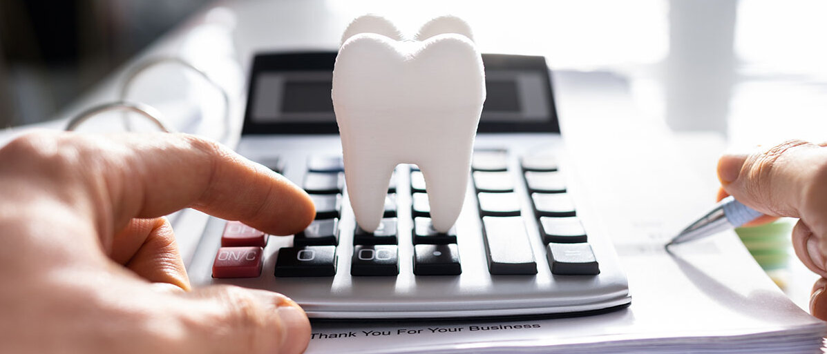 Mann bedient Taschenrechner, auf dem sich eine Zahnfigur befindet© AndreyPopov / iStock / Getty Images Plus