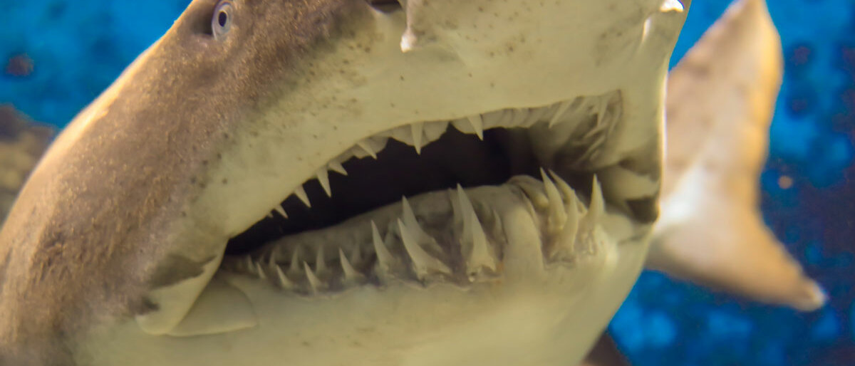Ein Haifisch mit geöffnetem Maul, man sieht mehrere Zahnreihen