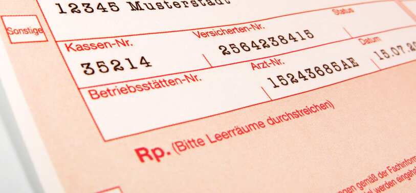 Blau: Privatpatienten erhalten beim Arzt ein blaues Rezept, die Medikation zahlen sie zunächst selbst. Das in der Apotheke abgestempelte Originalrezept reichen Privatpatienten dann zur Abrechnung an ihre Versicherung weiter.