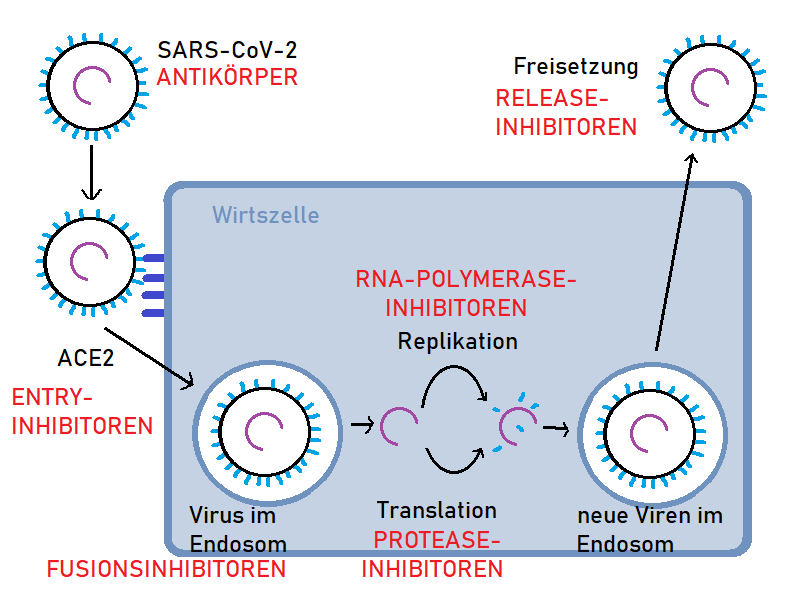 Um in die menschliche Wirtszelle zu gelangen, bindet SARS-CoV-2 an das Angiotensin-Converting-Enzyme 2 (ACE2). Anschließend wird das Spike-Protein des Virus in zwei Schritten durch eine membranständige Protease (Transmembrane protease serine subtype 2, TMPRSS2) gespalten. So können die Membranen von Virus und Wirtszelle verschmelzen und das Virus gelangt in die Zelle. Nun wird die virale Erbsubstanz übersetzt (translatiert), sodass sie von den Bestandteilen der Wirtszelle ausgelesen werden kann. Die Vervielfältigung der Virusbestandteile beginnt. Schließlich fügen die neuen Teile sich zu einem vollständigen Virus zusammen und werden aus der Zelle ausgeschleust. Jeder dieser Schritte ist ein möglicher Angriffspunkt für Arzneimittel.