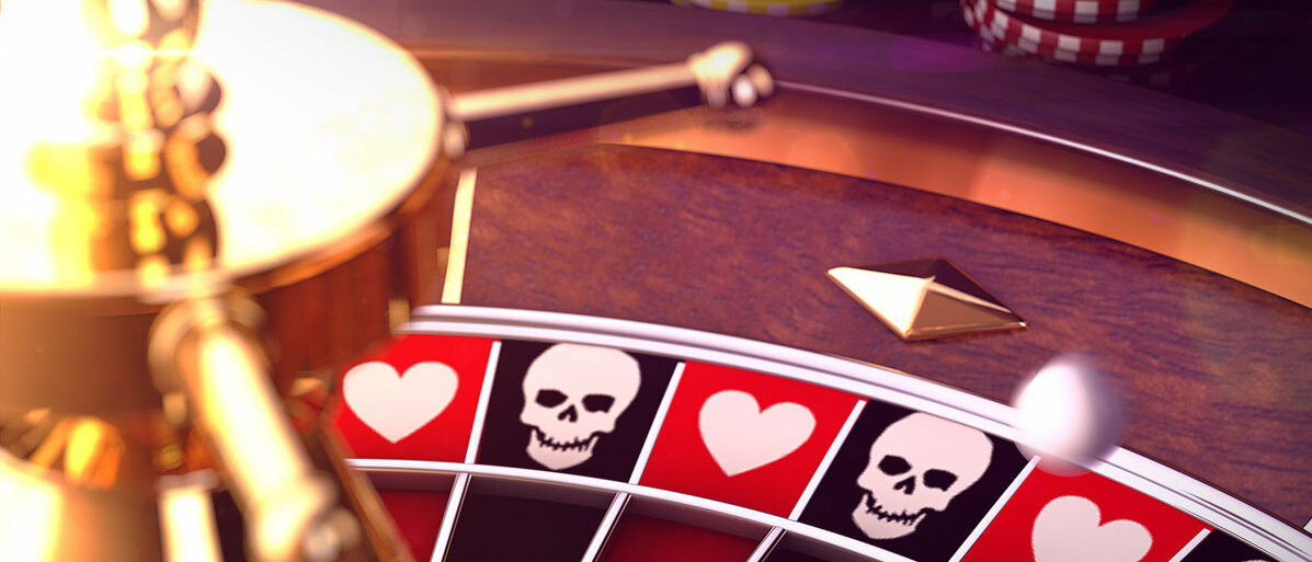 Ein Ausschnitt von eines Roulettetisches: Im Hintergrund stapeln sich Chips mit verschiedenen Werten, im Vordergrund sieht man das Rouletterad. Statt Zahlen tragen die roten Felder ein Herz-Symbol, die schwarzen einen Totenkopf.© mazartemka / iStock / Getty Images Plus