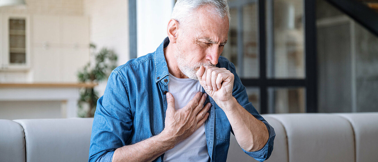 Hustender Mann, der sich mit der Hand an den Brustkorb fühlt.© brizmaker / iStock / Getty Images