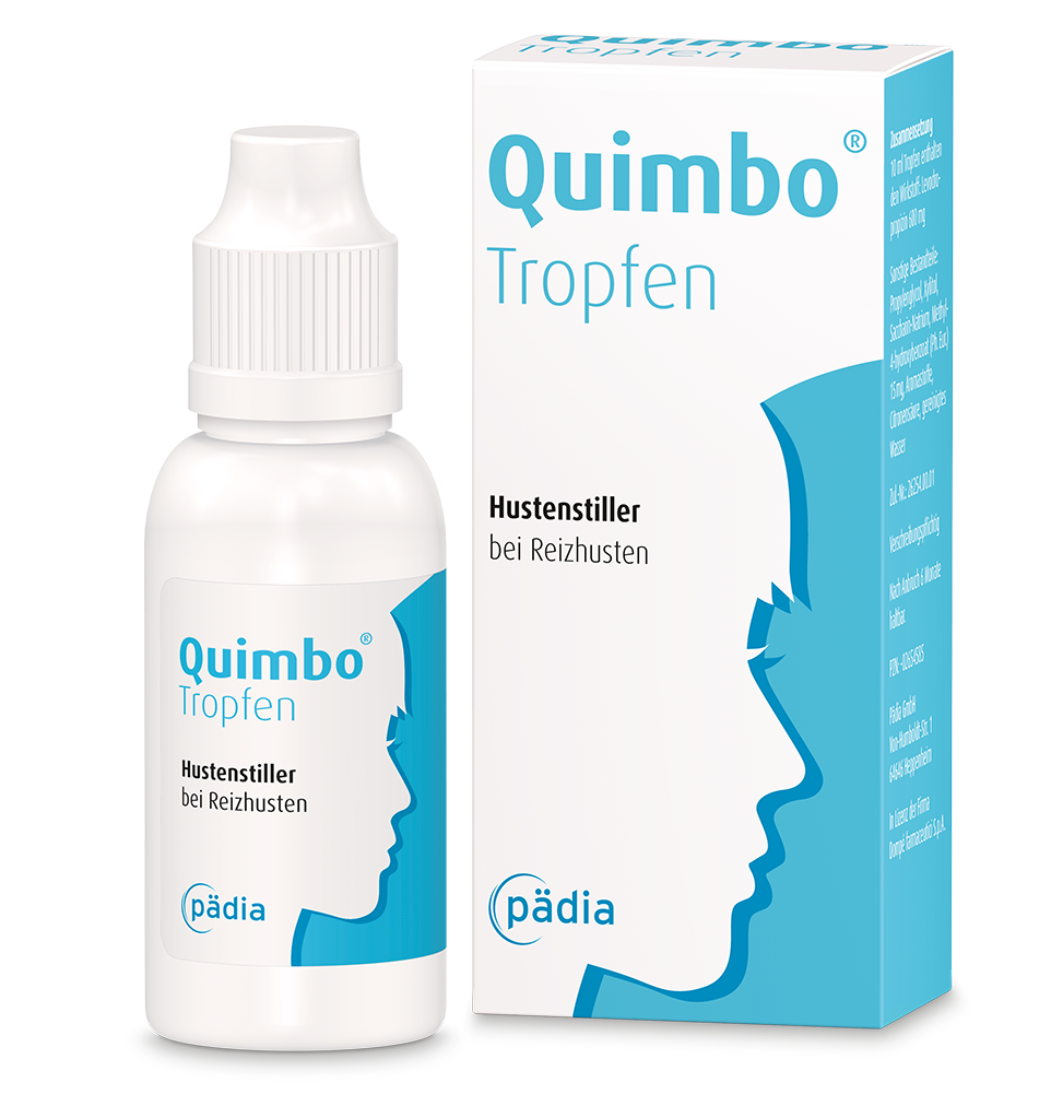 Quimbo® ist ein Hustenstiller mit dem Wirkstoff Levodropropizin. Es gibt ihn in verschiedenen Darreichungsformen. Der Quimbo® Sirup schmeckt angenehm nach Kirsche, die Quimbo® Tropfen zeichnen sich durch ihren Waldfruchtgeschmack aus. Sirup und Tropfen eignen sich nicht nur wegen ihrer guten Wirkung und der schnellen Wirksamkeit für Kinder ab zwei Jahren und Erwachsene: Im Vergleich zu Hustenstillern mit Dextromethorphan oder Pentoxyverin zeichnet sich Quimbo® durch seine periphere Wirkweise aus.