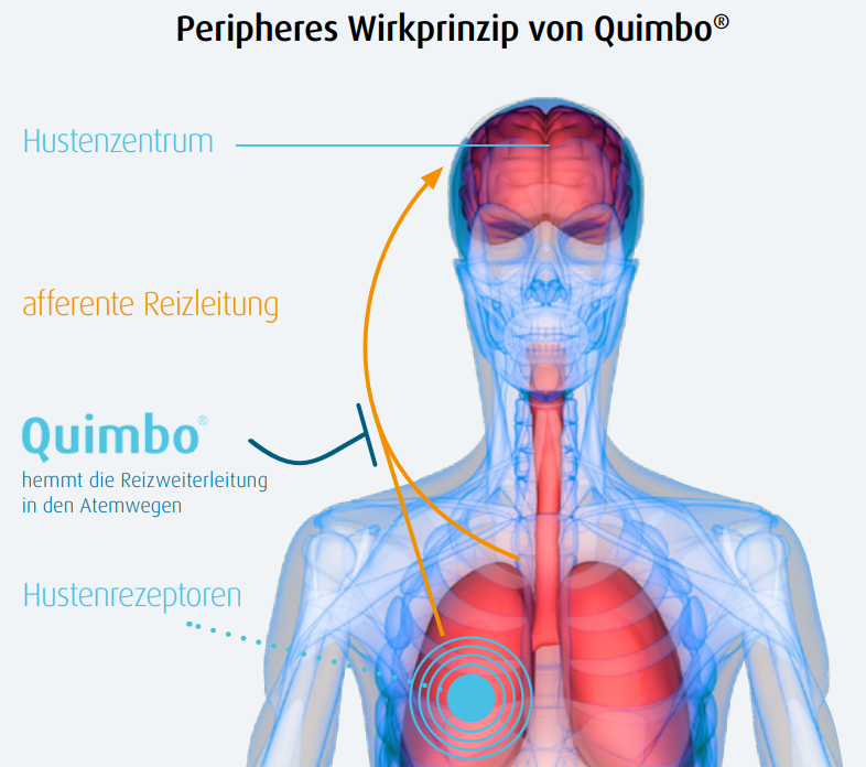 Der in Quimbo® enthaltene Wirkstoff unterdrückt den Hustenreiz direkt in den Atemwegen und nicht zentral im Gehirn. Daher sind keine zentral-wirksamen Nebenwirkungen wie Atemdepression und Suchtpotenzial bei Quimbo® zu erwarten. Zudem löst der in Quimbo® enthaltene Wirkstoff keine bekannten Wechselwirkungen aus. Dies ist besonders bei Menschen mit Polymedikation ein Vorteil.