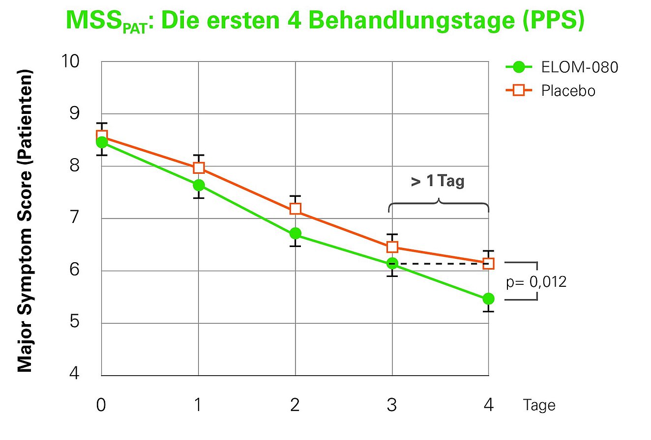 Die Wirksamkeit der Behandlung einer Rhinosinusitis mit GeloMyrtol® forte wurde zuletzt in einer doppelt verblindeten, placebokontrollierten, randomisierten Multicenterstudie an über 460 Patienten erneut bestätigt7. Eingeschlossen wurden Betroffene, die mindestens drei der fünf definierten Symptome (Rhinorrhoe, Postnasal Drip, nasale Kongestion, Kopfschmerz, Gesichts-/ Druckschmerz) des Major Symptom Scores (MSS) aufwiesen. Zur Bewertung durch die behandelnden Ärzte und die Patienten wurden für jedes der Symptome Punkte zwischen 0 (nicht vorhanden) über 1 (leicht), 2 (mäßig) und 3 (schwer) vergeben. An der Studie nahmen Patienten zwischen 18 und 79 Jahren in 23 Prüfzentren (Allgemeinmediziner, Internisten, HNOÄrzte) teil, deren Symptom-Score zwischen 8 und 12 Punkten (von maximal 15 erreichbaren Punkten) lag – die also unter moderaten bis schweren Symptomen litten. Bereits am vierten Tag zeigte die GeloMyrtol® forte- Gruppe eine signifikant bessere Symptomlinderung und einen Behandlungsvorsprung von mehr als einem Tag im Vergleich zu Placebo. In der zweiten Woche vergrößerte sich der Behandlungsvorsprung auf drei Tage7.