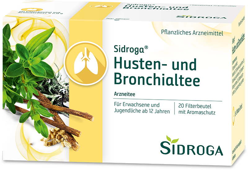 Sidroga® Husten- und Bronchialtee. Arzneitee. Zusammensetzung: 1 Filterbeutel (à 2,0 g) enthält: Wirkstoffe: 0,7 g Thymiankraut, 0,5 g Eibischwurzel, 0,3 g Spitzwegerichblätter, 0,3 g Süßholzwurzel, 0,2 g Isländisches Moos. Anwendungsgebiete: Traditionelles pflanzliches Arzneimittel zur Schleimlösung und Reizlinderung bei Husten im Zusammenhang mit Erkältungen ausschließlich aufgrund langjähriger Anwendung. Gegenanzeigen: Allergie gegen einen der Bestandteile oder Lippenblütler. Nebenwirkungen: Allergische Reaktionen (Atemwege, Haut) und Magen-Darm-Beschwerden. Längere Anwendung von Süßholzwurzel kann den Mineralstoffwechsel beeinflussen (Natrium- und Wasserretention, Kaliumverlust mit Bluthochdruck, erhöhtem Hirndruck, Herzrhythmusstörungen, Ödeme).