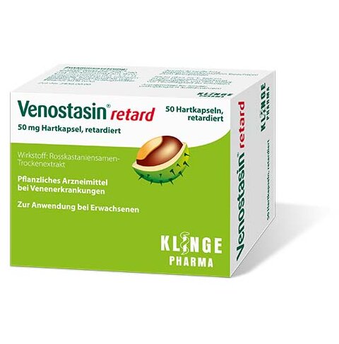 Venostasin® retard 50 mg Hartkapsel, retardiert: Wirkst.: Rosskastaniensamen-Trockenextrakt. Zusammensetz.: 1 Hartkapsel, retardiert, enthält 240 – 290 mg Trockenextrakt aus Rosskastaniensamen (4,5 – 5,5 : 1), entspr. 50 mg Triterpenglykoside, berechnet als wasserfr. Aescin. Auszugsmittel: Ethanol 50 % (v/v). Sonst. Bestandt.: Dextrin, Copovidon, Gelatine, Talkum, Ammoniummethacrylat-Copolymer (Typ A u. B), Triethylcitrat, Na-Dodecylsulfat, Titandioxid, Eisen(II,III)-oxid, Indigocarmin, Chinolingelb, Eisen(III)-oxid, Eisen(III)-hydroxid-oxid × H2O. Anwendungsgebiet: Bei Erwachsenen zur Behandlung v. Beschwerden bei Erkrankungen d. Beinvenen (chron. Veneninsuffizienz), z.B. Schmerzen u. Schweregefühl i. d. Beinen, nächtl. Wadenkrämpfe, Juckreiz u. Ödeme. Gegenanz.: Überempfindlichkeit gegen d. Wirkst. od. sonst. Bestandt. Nebenw.: Gelegentlich: Übelkeit, Erbrechen, Durchfall, Magen- u. Darmbeschwerden (Schleimhautreizungen), Schwindel, Kopfschmerzen. Selten: Überempfindlichkeitsreaktionen d. Haut (Juckreiz, Hautausschlag). Sehr selten: Schwerwiegende allerg. Reaktionen (z. T. mit Blutungen), gynäkolog. Zwischenblutungen, Tachykardie, Hypertonie. Weitere Hinw.: s. Fachinformation. Apothekenpflichtig. Stand: 04/2017-1. Klinge Pharma GmbH, 83607 Holzkirchen, Deutschland