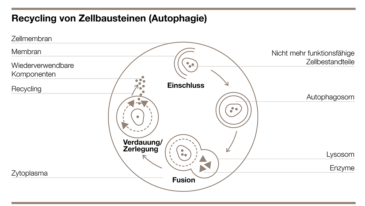 Sämtliche Körperzellen sind fortwährend intensiv mit Aufräumarbeiten beschäftigt. Sie können Eiweißstoffe, Organellen (spezialisierte Untereinheiten innerhalb der Zelle, die bestimmte Rollen oder Funktionen erfüllen) und andere Zellbestandteile, die nicht mehr intakt sind, enzymatisch abbauen und in ihre Grundelemente zerlegen. Die Bausteine werden wieder zur Bildung neuer, komplett funktionstüchtiger Zellbestandteile verwendet3.