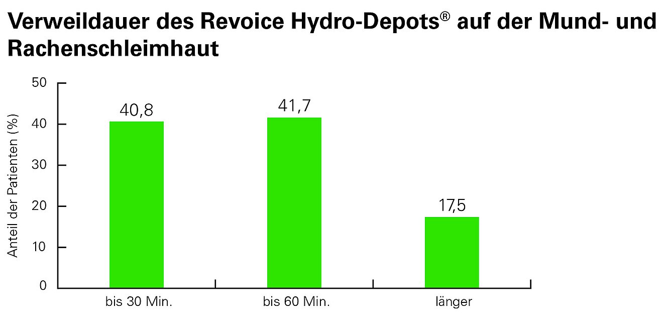 Die Wirksamkeit von GeloRevoice® konnte auch in einer Beobachtungsstudie mit rund 1000 Patienten nachgewiesen werden7. Die Teilnehmenden litten unter Heiserkeit, Halsschmerzen, Kratzen im Hals, Hustenreiz oder Schluckbeschwerden und verwendeten über mehrere Tage GeloRevoice® Halstabletten. Die Rückmeldungen waren eindeutig: Die Mehrheit berichtete von einer spürbaren Befeuchtung und von einem lang anhaltenden Schutzfilm, der bis zu eine Stunde oder länger auf der Schleimhaut verblieb (Abb. 1). Im Durchschnitt verbesserten sich die Beschwerden nach der Anwendung um 53,8 Prozent. Entsprechend positiv fiel das Gesamturteil aus: Rund 82 Prozent der Studienteilnehmer bewerteten GeloRevoice® mit „gut“ oder „sehr gut“.