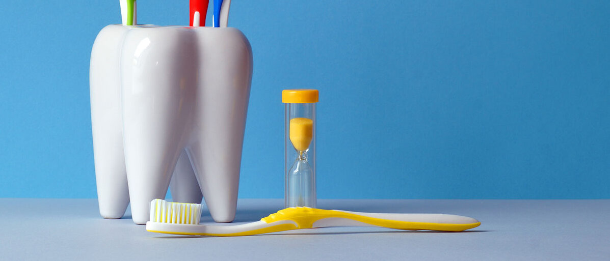 In einem Zahnputzbecher in Form eines großen Zahns stecken mehrere Zahnbürsten. Daneben liegt eine weitere Zahnbürste und dort steht eine kleine Sanduhr.© Sergey Gorelchik / iStock / Getty Images Plus