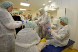 An alles gedacht Im Reinraum A befinden sich keine Menschen, nur durch ein Handschuheingriffsystem kann direkt an der Abfüllanlage gearbeitet werden. Zwei Mitarbeiterinnen stehen in Reinraum B und überwachen die Vorgänge in A. Die beiden sind komplett vermummt, nur die Augen sind zu sehen. Sie tragen zwei Paar Handschuhe übereinander, damit auch dann keine Keime von ihnen ausgehen, wenn ein Handschuh doch einmal reißen sollte.