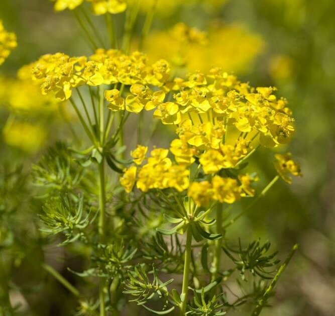 Euphorbia cyparissias ist eine Giftpflanze aus der Gattung der Wolfsmilchgewächse , die in ganz Europa bis in die alpinen Höhenstufen verbreitet ist. Euphorbien sind weltweit mit mehr als 2000 Arten vertreten und weisen eine große Vielfalt auf. Neben krautigen Pflanzen wie der Zypressen-Wolfsmilch bilden Wolfsmilchgewächse auch verholzende Sträucher oder Bäume. Bereits im frühen Altertum waren Wolfsmilcharten bekannt. Euphorbia cyparissias wurde im Corpus Hippocraticum, einer Sammlung von mehr als 60 antiken medizinischen Texten aus dem vierten vorchristlichen Jahrhundert, als diätetisches Mittel aufgeführt.